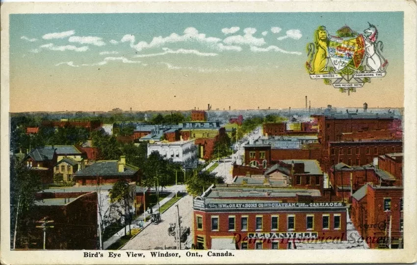 Color postcard depicting an elevated view of commercial buildings along a street in Windsor. Signs read "J.E. Banwell" and "Wm. Gray & Sons Co."