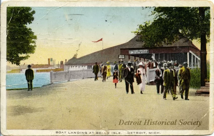 Color postcard depicting a crowd of people departing the ferry landing on Belle Isle. A sign reads "Take This Side to the Boat".