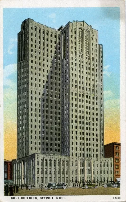 Printed on verso: The New Buhl building, Detroit, Mich. This modern skyscraper is located at Griswold and Congress Sts., on the site of the old Buhl Building. The structure is 26 stories high, the lower floors covering the entire area of the lot and upper floors are built in the shape of a Maltese cross.