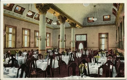 Click to enlarge 2012.045.843 Postcard Cafe, Hotel Plaza, Detroit, Mich. Color postcard depicting the Café at the Hotel Plaza. Date c. 1925 Collection Postcard Search Terms Restaurants, Interiors, Hotel Plaza, Hotels Request Image