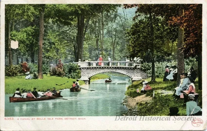 Request ImageColor postcard depicting canoes on a Belle Isle canal, with people along the shore and a stone bridge in the background.