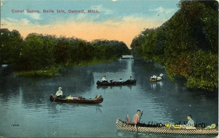 Printed on verso: Canal Scene, Belle Isle, Detroit, Mich. Canoeing is the leading sport at Belle Isle. Its 702 acres are covered by many miles of Canals and Lakes. When Free Band Concerts are in progress during the summer months, hundreds of canoes dot the different canals and make a pretty sight.