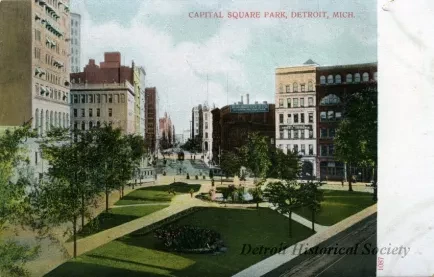 Color postcard depicting Capitol Park, with a fountain, pedestrians, and a view down Griswold Street. Signs read, "John Winter & Co. General Insurance", and "Dean, Godfrey & Co, Interior Decorators". On the left is the Chamber of Commerce Building.
