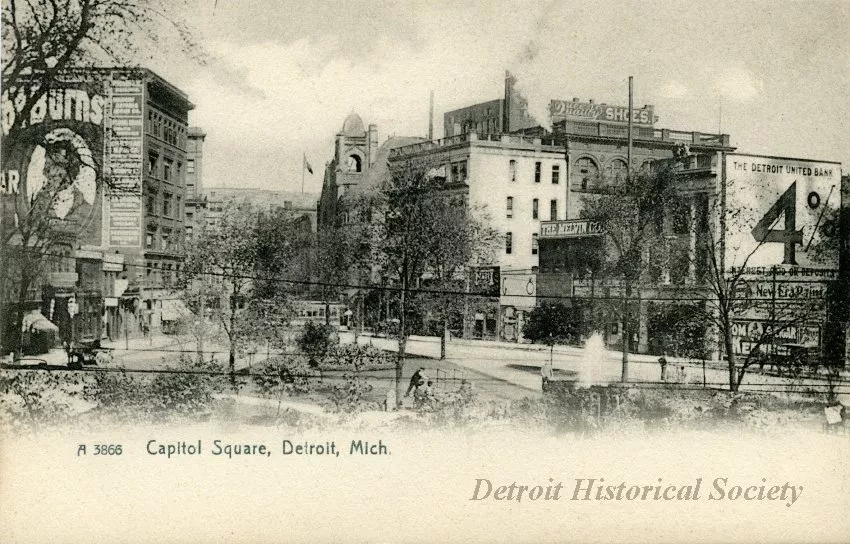 Black and white postcard depicting Capitol Park facing north, with a fountain, pedestrians, and commercial building. Signs read, "Queen Quality Shoes.", "The Detroit United Bank 4% Interest [ ] on Deposits", and "The Melvin Co."
