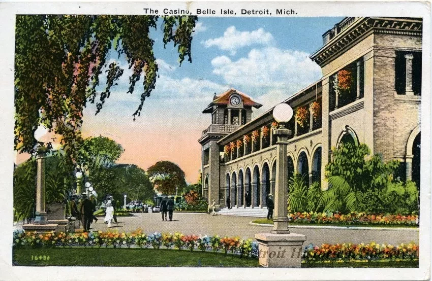 Color postcard depicting the Casino on Belle Isle, with several people in front.