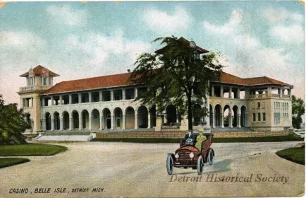Printed on verso: Casino, Belle Isle. Detroit's principal recreation spot, is an island in the Detroit river connected with the city by a bridge, 8 feet less than half a mile in length. It comprises 702 acres, is over two miles long and boasts of over 20 miles of fine macadam roadway, which completely circles and frequently intersects it. A fine zoo, aquarium, horticultural building, swimming and skating pavilions, casino and boat livery are in connection. The city has expended over $1,500,000 on it since its purchase in 1879.