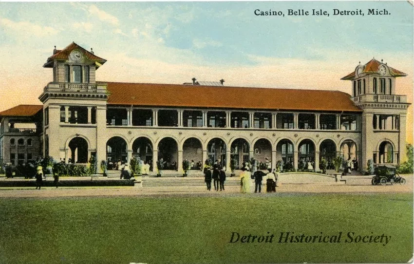 Request ImageColor postcard depicting the Casino on Belle Isle, with many people and a parked car in front.