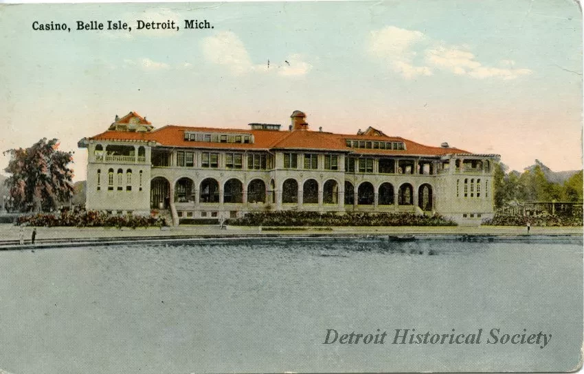 Color postcard depicting the Casino on Belle Isle, with Lake Tacoma in the foreground.
