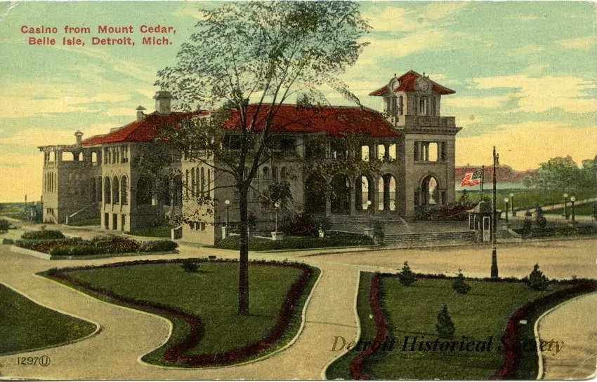 Printed on verso: Casino, Belle Isle. Belle Isle is in the Detroit River between Detroit and Windsor, Canada. The Island contains 702 acres and is entirely covered with one of the most beautiful parks in the United States, having some 21 miles of Macadam Roads; a magnificent Casino; Pavilions; Boat Houses; Aquarium; Horticultural Hall and Zoological Gardens. The island was purchased by Detroit in 1879, and has since then expended $1,600,000 in beautifying it.
