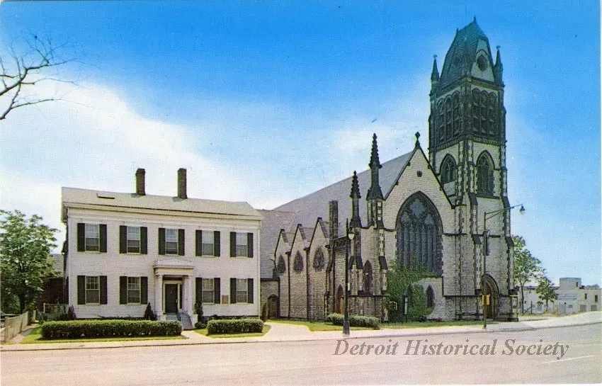 Printed on verso: Christ Church 960 East Jefferson Ave., Detroit, Mich. with its lovely interior and many beautiful memorials is the oldest Protestant religious site in the city. Adjoining it is Sibley House, the rectory, which is the oldest house in the city preserved in its original dimensions.