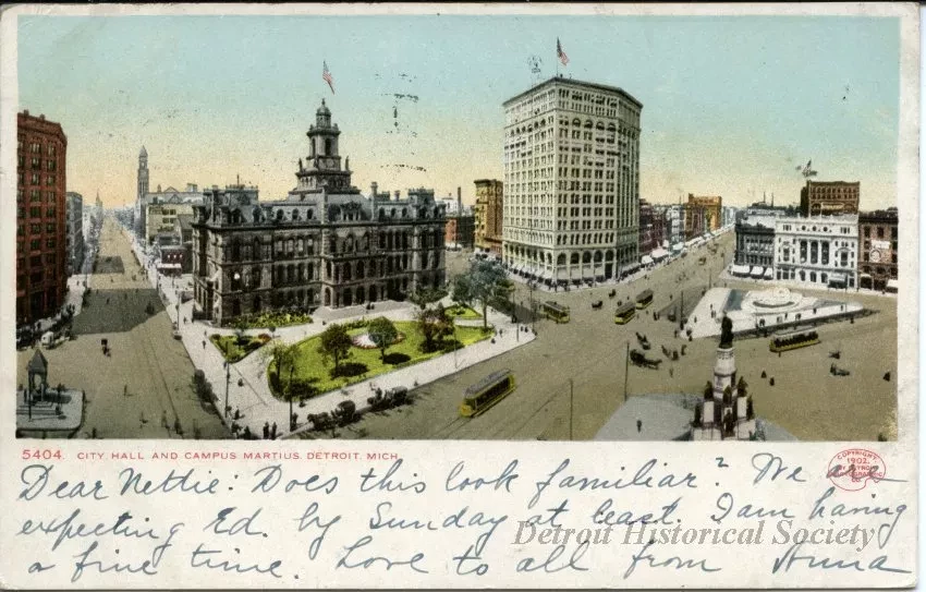 Color postcard depicting City Hall, Majestic Building and views along Woodward Avenue and Fort Street from Campus Martius. In the foreground is the Soldiers' and Sailors' Monument.