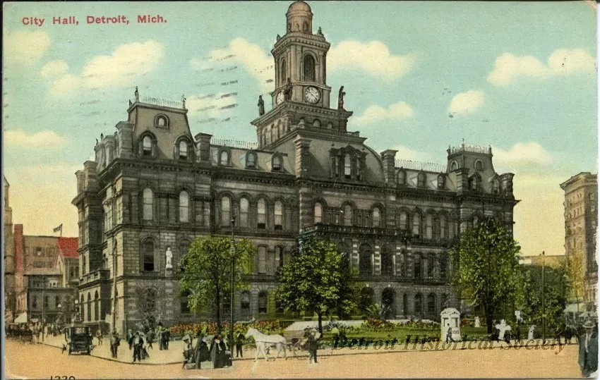 Printed on verso: "THE DETROIT CITY HALL, in which are located the administrative offices of the city, was erected in 1869. It is a handsome and substantial structure, situated on Woodward Avenue, between Fort Street and Lafayette Avenue, occupying an entire block. The city spent $50,000 remodeling the interior in 1906. To the left is shown Fort Street, one of the leading business thoroughfares and which connects the heart of the city with the immense manufacturing establishments in Delray and other down-river industries."
