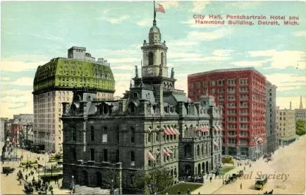 Printed on verso: City Hall, Pontchartrain Hotel and Hammond Bldg. This handsome group of buildings is situated in the heart of the business section of Detroit and it goes without saying that they are a credit to this already distinguished city.