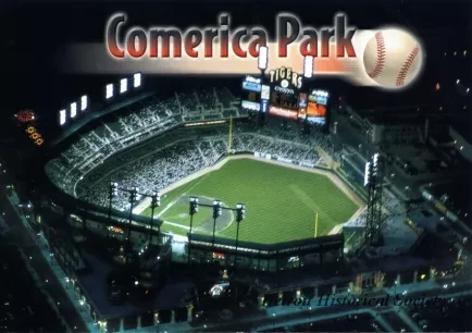 One postcard of Comerica Park in downtown Detroit. The postcard shows a nighttime aerial color photographic image of the baseball field and surrounding stands. Printed text on the verso reads D-123, Night view of the spectacular Comerica Park, home of the Detroit Tigers." Additional printed text reads "Perrin Souvenir Distributors, Grand Rapids, MI. Phone 616-785-9700."