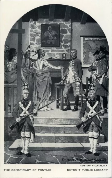 Black and white postcard depicting the "The Conspiracy of Pontiac" mural by Gari Melchers in the Detroit Public library.