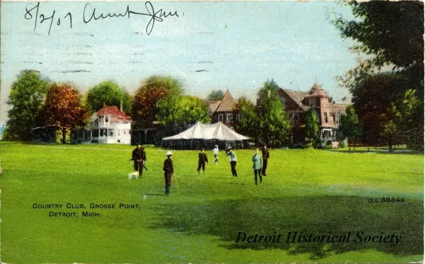 Color postcard depicting people standing in an open field at the Country Club of Detroit in Grosse Pointe Farms. In the background are large houses and a white tent.