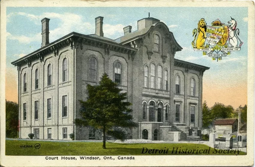 Color postcard depicting the District Courthouse on the east side of Sandwich Street in Windsor. Superimposed on the scene is a coat of arms with the motto, "On Whose Dominions the Sun Never Sets".