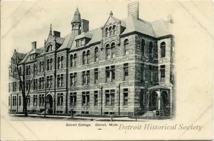 Black and white postcard depicting Detroit College on E Jefferson Avenue.
