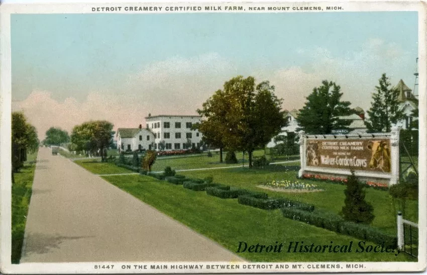 Color postcard depicting the Detroit Creamery in Mt. Clemens, from Gratiot Avenue. A Walker & Co. billboard reads "Detroit Creamery Certified Milk Farm, The Home of Walker-Gordon Cows".