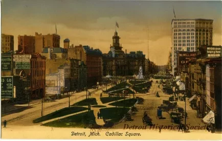Postcard. Illustration of Cadillac Square. Front reads, "Detroit, Mich. Cadillac Square." City Hall can be seen in the distance. Signs that can be seen in the image read, "McGregor Helping Hand Mission," McWilliams Wholesale Gr.., "Peter Smithsons Wholesale [..] Butter, Eggs & Cheese, "Marz Capsule, Manufacturer of Capsules," and "Sarsaparilla Vitalizes the Blood."