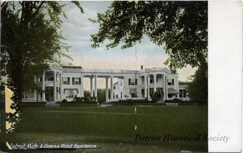 Color postcard depicting the houses of Alexander Lewis and Alexander Ingersoll Lewis connected by a portico in Grosse Pointe Farms.