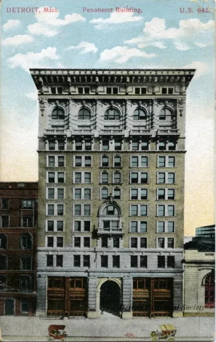 Color postcard depicting the Penobscot Building on W Fort Street, with automobiles in front and the State Savings Bank to the right.