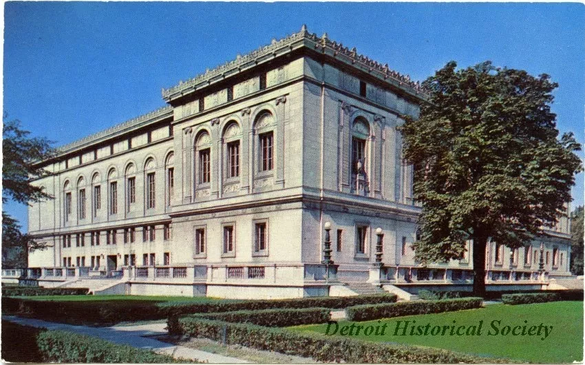 Printed on verso: The Detroit Public Library. Main Building, Detroit, Michigan. Of Italian Renaissance style architecture, the main building is one of the showplaces of Detroit.