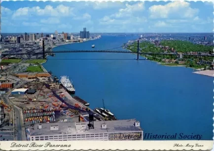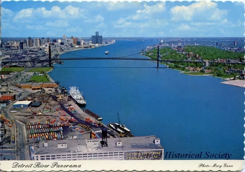 Printed on verso: The Detroit River, serving the industrial and commercial needs of both Detroit and Windsor, Ontario, is a vital link in the St. Lawrence Seaway system. This river also provides varied recreation in boating and fishing. The Detroit skylines with Renaissance Center, Ambassador Bridge and terminal facilities are seen in this unusual aerial view.