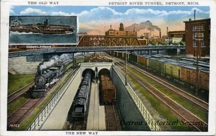 Printed on verso: Has the unique distinction of being the only tunnel of its type ever built. It was constructed in sections, all work being done from the surface of the water without the use of compressed air. The Tunnel is operated electronically. Construction was started October 1, 1906, and completed July 1, 1910. The length from portal to portal is 1 3/8 miles, and from summit of grade 2 ½ miles. It was built by the Detroit River Tunnel Company for the M. C. R. R. at a cost of $8,500,000.