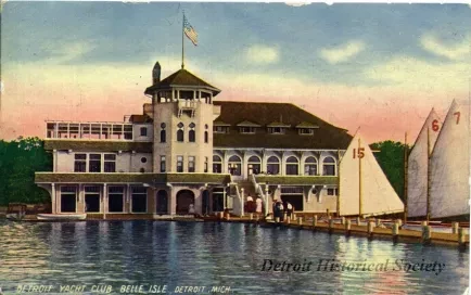 Printed on verso: Detroit Yacht Club, Belle Isle. - This handsome home of the club was built in 1905 to replace their former home, destroyed by fire. It cost $20,000. The club is one of the largest on the great lakes, features sailing and maintains a fleet of 20 one-design cat-boats in which the members sail weekly in regattas.