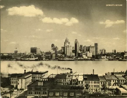 Printed on verso: Detroit Skyline. A fine view of downtown Detroit with its skyscrapers grouped around the river front at the foot of Woodward Avenue. Tied up at the docks are two of the large boats that ply the Great Lakes. In the foreground, by contrast, are the flat roofs of the low buildings in Windsor, Ontario, on the Canadian side of the Detroit River. Just below Detroit is the only point in the U. S.-Canadian boundary where Canadian territory lies south of the United States.