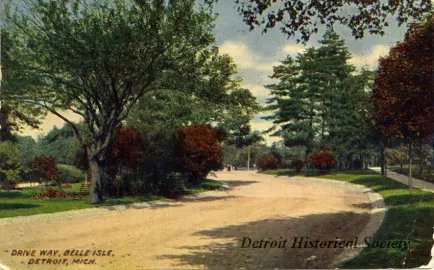 Printed on verso: Drive Way, Belle Isle. - Detroit's principal recreation spot, is an island in the Detroit river connected with the city by a bridge, 8 feet less than half a mile in length. It comprises 702 acres, is over two miles long and boasts over 20 miles of fine macadam roadway. A fine zoo, aquarium, horticultural building, swimming and skating pavilions, casino and boat livery are in connection. The City has expended over $1,500,000 on it since its purchase in 1879.