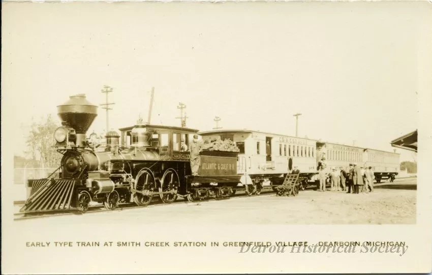 Black and white photographic postcard depicting a train stopped at the Smith's Creek Depot in Greenfield Village, with many people standing alongside. The train cars are marked "Sam Hill", "Atlantic & Gulf R.R.", "C.D. & C.G.T. Jct. R.R.", and "Bangor & Aroostook".
