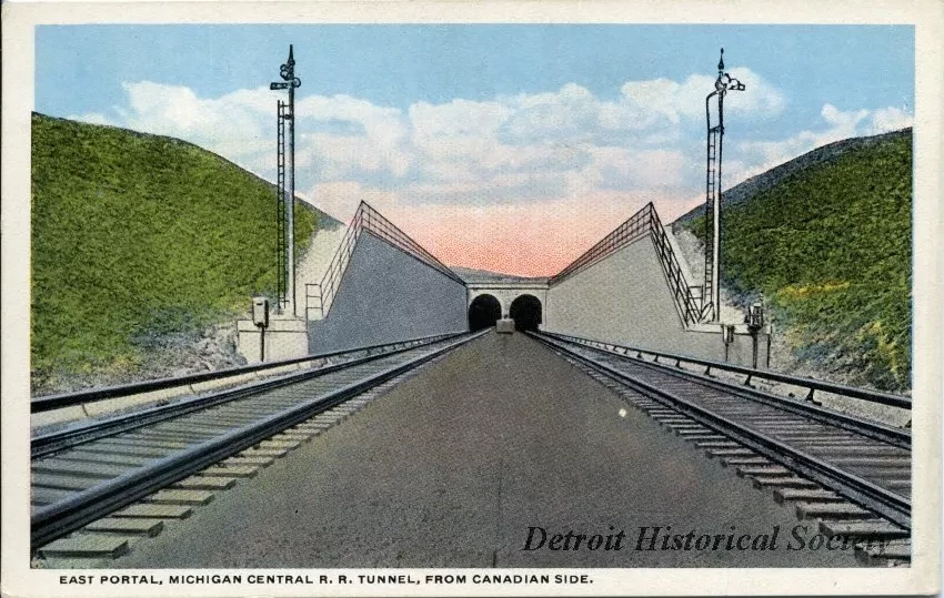 Printed on verso: East Portal, Michigan Central R. R. Tunnel, from the Canadian Side. The Detroit River Tunnel, has the unique distinction of being the only tunnel of its type ever built. It was constructed in sections, all work being done from the surface of the water without the use of compressed air. The Tunnel is operated electronically. Construction was started October 1, 1906, and completed July 1, 1910. The length from portal to portal is 1 3/8 miles, and from summit of grade 2 ½ miles. It was built by the Detroit River Tunnel Company for the M. C. R. R. at a cost of $8,500,000.