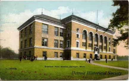 Color postcard depicting Eastern High School from the corner of Mack Avenue and E Grand Boulevard.