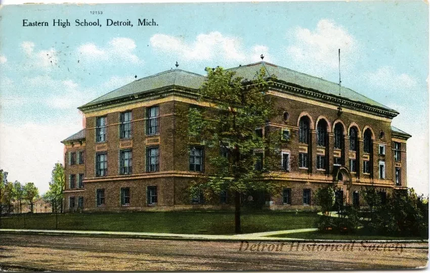 Color postcard depicting Eastern High School from the corner of Mack Avenue and E Grand Boulevard.
