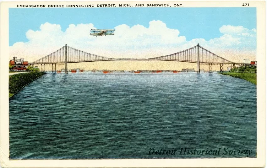 Printed on verso: Embassador [sic] Bridge. The Detroit International Bridge, spanning the Detroit River at Detroit and Sandwich, Ontario, Canada." The Curt Teich and Company logo is also printed on the verso.