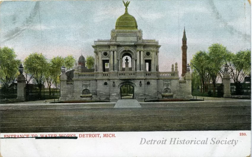 Color postcard depicting the Hurlbut Memorial Gate at Water Works Park from E Jefferson Avenue, with a tower in the background.