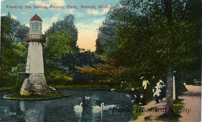 Printed on verso: Scene at Palmer Park, Detroit, Mich. Palmer Park, where light house is located is a restful retreat of 120 acres and is located seven miles out Woodward avenue. One of the delightful features is its Log Cabin with its quaint furniture. It has many acres of woods, children's playgrounds and a casino where refreshments are served.