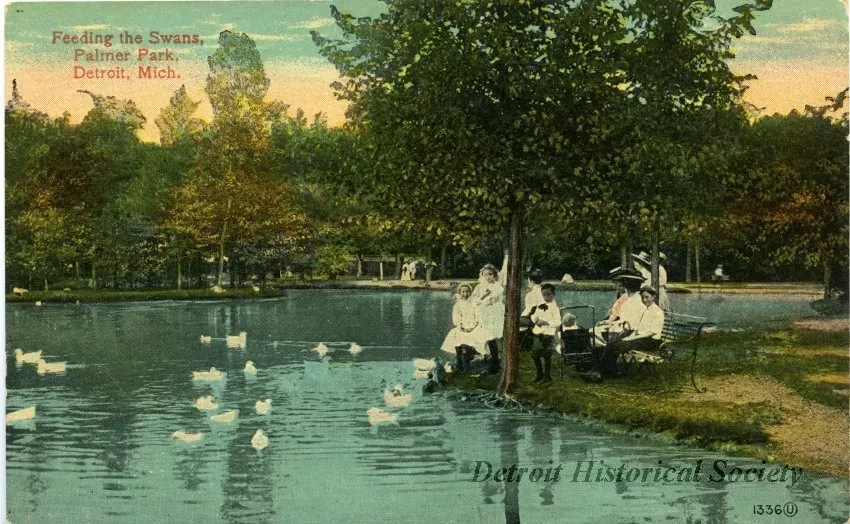 Printed on verso: Feeding the Swans, Palmer Park. Built on land donated to the City by Ex-Senator Thomas W. Palmer, in 1893, and is situated north of the city at the extreme terminal of the Woodward Ave. car line; is one of the city's favorite breathing spots. Its center piece is a log cabin, which is an exact reproduction of the home in which Senator Palmer resided when Detroit was little more than a trading post.