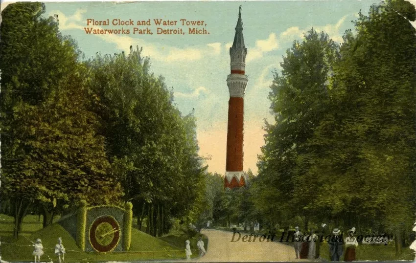 Printed on verso: Floral Clock and Water Tower, Waterworks Park. The 72-acre plot of ground on Jefferson Avenue, owned by the city and partially occupied by its waterworks pumping station, has been made one of Detroit's beauty spots. The water supply is pumped through a long tunnel from Lake St. Clair to the distributing point. The Park is noted for its big floral clock and the memorial at the entrance.