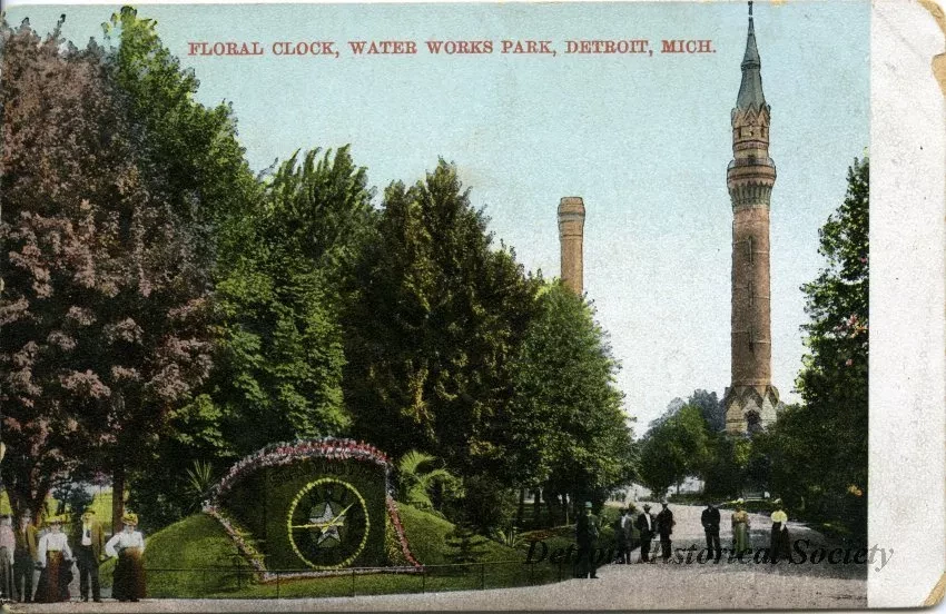 Color postcard depicting the floral clock reading "Standard Time" in Water Works Park, with pedestrians on the road and the tower and a smoke stack in the background.