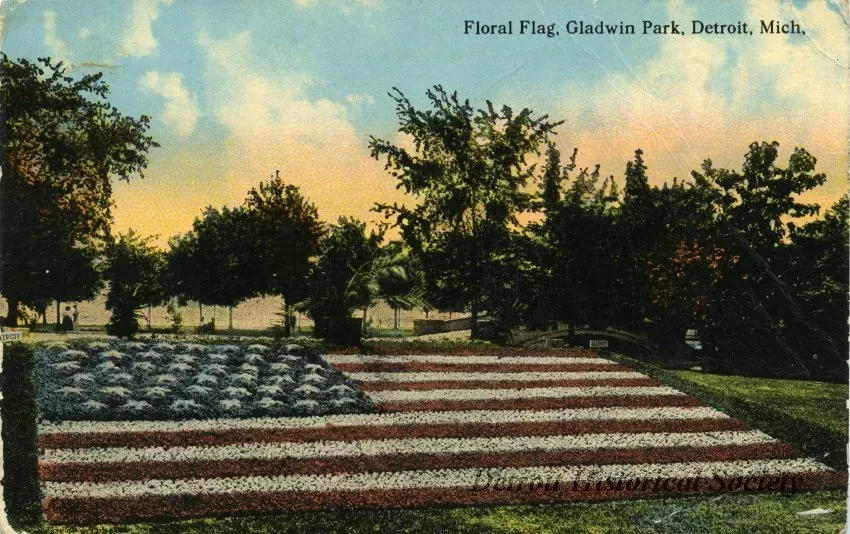Printed on verso: Floral Flag, Gladwin Park, Detroit, Mich. The Floral Flag is located at Gladwin Park. The source of Detroit's Water Supply. Over 73 million gallons of water are pumped daily for Detroit's use. Take Jefferson Avenue cars going East.