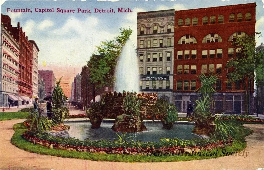 Printed on verso: Capitol Square Park, situated in the business district of the city, is one of the many small breathing spots which Detroit's Park and Boulevard Commission keeps beautiful the year round. It takes its name from the fact that, for several years, the building housing the Michigan offices occupied the property, before the center of government was transferred to Lansing.