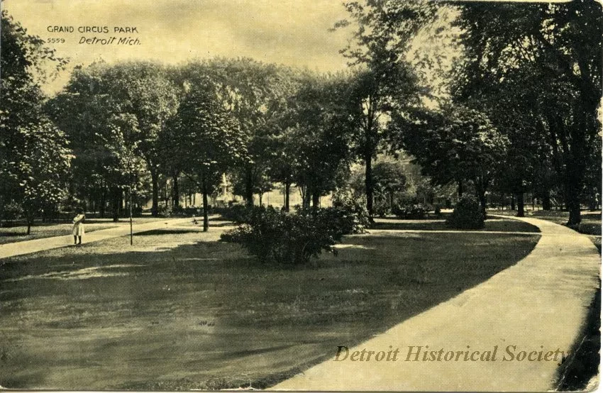 Black and white postcard depicting a scene in Grand Circus Park with many trees and two paths, one with a pedestrian on it.