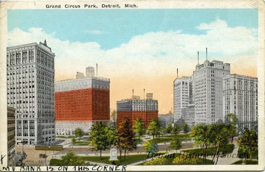 Color postcard depicting an elevated view of Grand Circus Park, facing west. The David Whitney Building, Hotel Statler, Hotel Tuller, Kresge Building, Grand Park Centre, and Fyfe Building are in view. Many pedestrians and a streetcar on Woodward Avenue.
