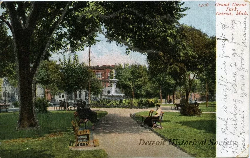 Color postcard accented with silver glitter depicting a fountain in Grand Circus Park with people on benches nearby and buildings in the background.