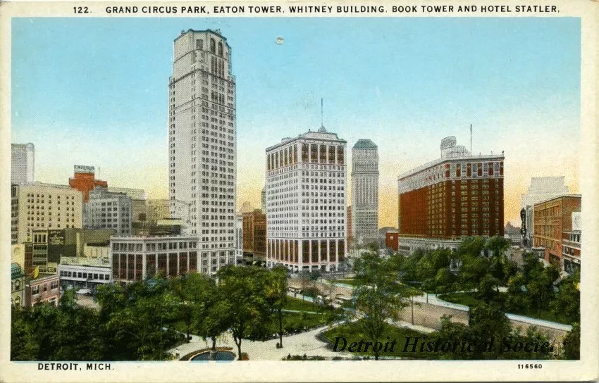 Grand Circus Park, Eaton Tower, Whitney Building, Book Tower and Hotel Statler, Detroit, Mich.