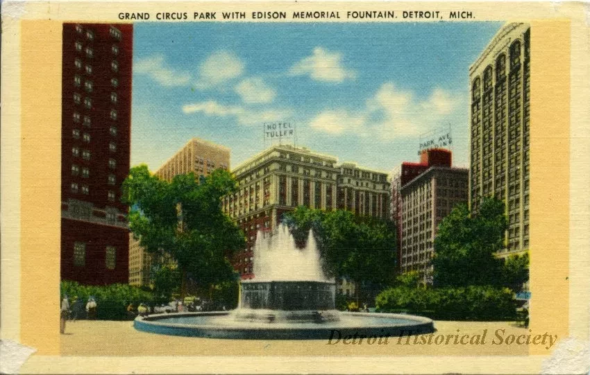 Printed on verso: Surrounded by office buildings and fine hotels, Grand Circus Park with Edison Memorial fountain provides a refreshing center of interest in the heart of the city.
