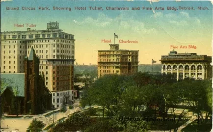 Grand Circus Park, Showing Hotel Tuller, Charlevoix and Fine Arts Bldg. Detroit, Mich.